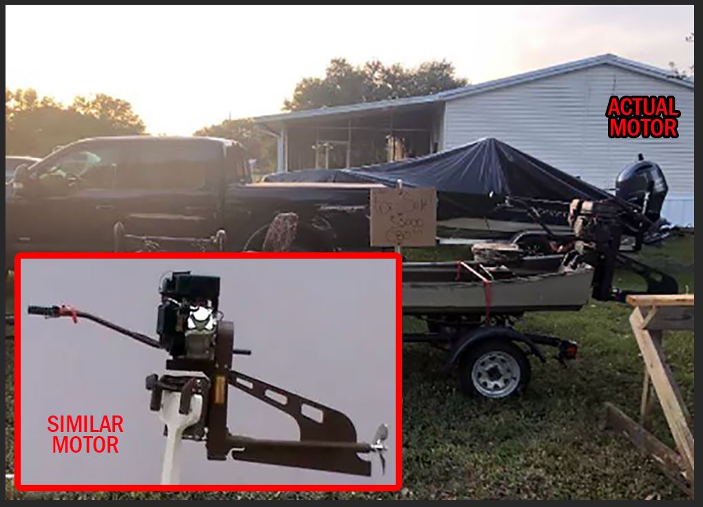 The stolen motor is described as a black Copperhead Predator 6.5hp mud motor.