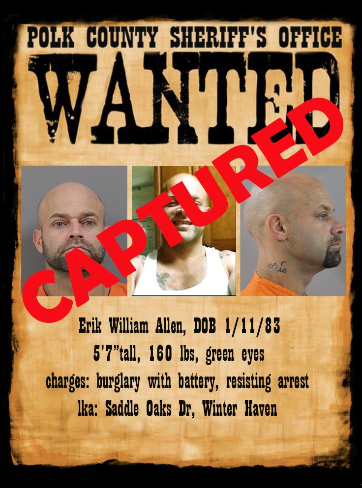 Allen has an extensive criminal history & he’s been to state prison 4 times since 2003 for crimes he committed in Hillsborough and Polk. His last known address is on Saddle Oaks Drive in Lakeland. He has a tattoo on the right side of his next that says “Lisa,” he’s 5’7” tall, 160 lbs, bald with green eyes. He has a Polk County warrant for burglary with battery, and resisting arrest.